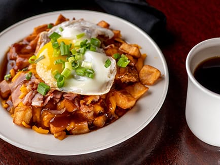 Two eggs, toast and home fries.